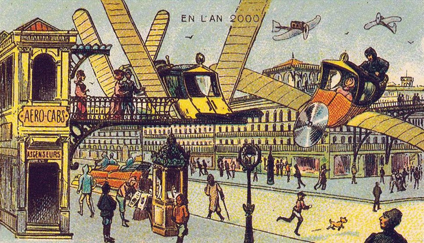 For a long time, I’ve been fascinated by depictions of the future – or, to put it another way, a possible future. On Twitter, I follow the excellent History Lovers Club (@historylvrsclub) and have been intrigued by their periodic inclusion of a series of postcards produced at the end of the nineteenth century. Principally the work of an artist called Jean-Marc Côté, these cards depict France in the year 2000 as a place where much goes on in the skies. Vehicles and planes are held aloft by great flapping wings and propellers that looked like buzz-saws. The people in this imagined future dress very much like upper-class Frenchmen and women of that century. Most of all, technology has transformed life while retaining a definite flavour of the old world: levers, pulleys, brass speakers resembling trumpets, contraptions on scurrying wheels, and awnings on buildings such as you’ll still find in French cities.